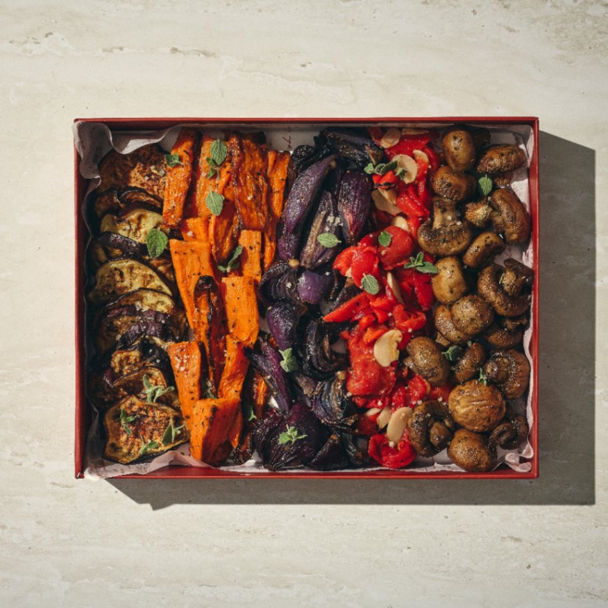 מבחר ירקות קלויים בתנור, משתנה לפי עונתיות.