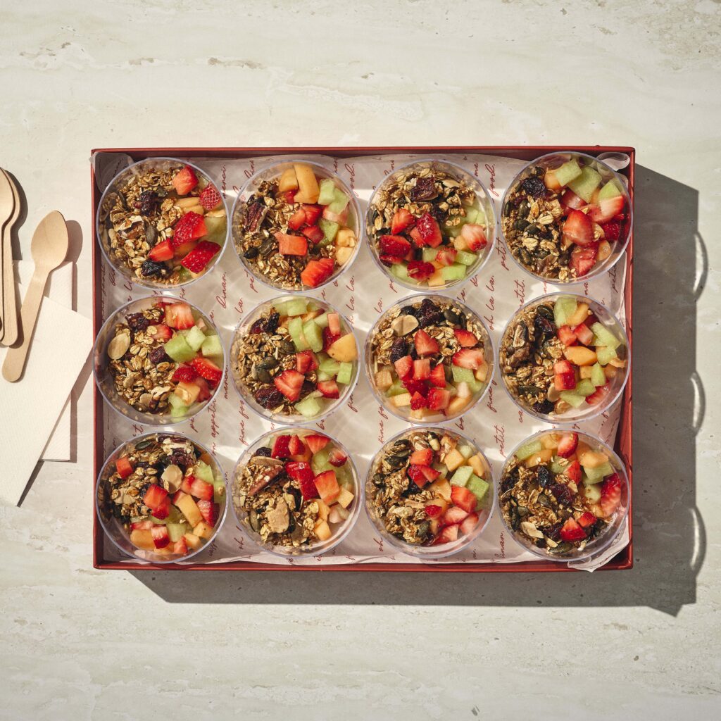 פירות טריים עם יוגורט וגרנולה עבודת יד.
