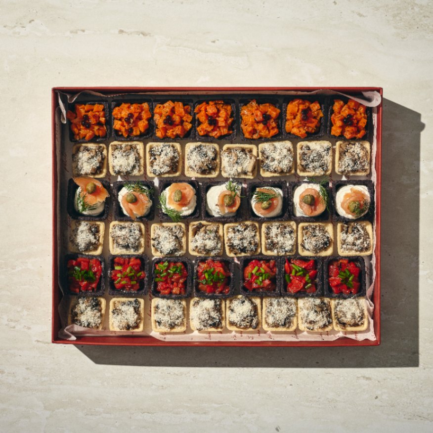 טארטלטים קטנים עבודת יד מבצק פריך שחור במגוון מילויים: קוביות בטטה, גבינת שמנת וסלמון מעושן וצלפים, פטריות ופרמזן, פלפל קלוי וכדורי בלסמי מצומצם. מומלץ לאירועים מיוחדים בסגנון פינגר-פוד 35 יחידות במגש.