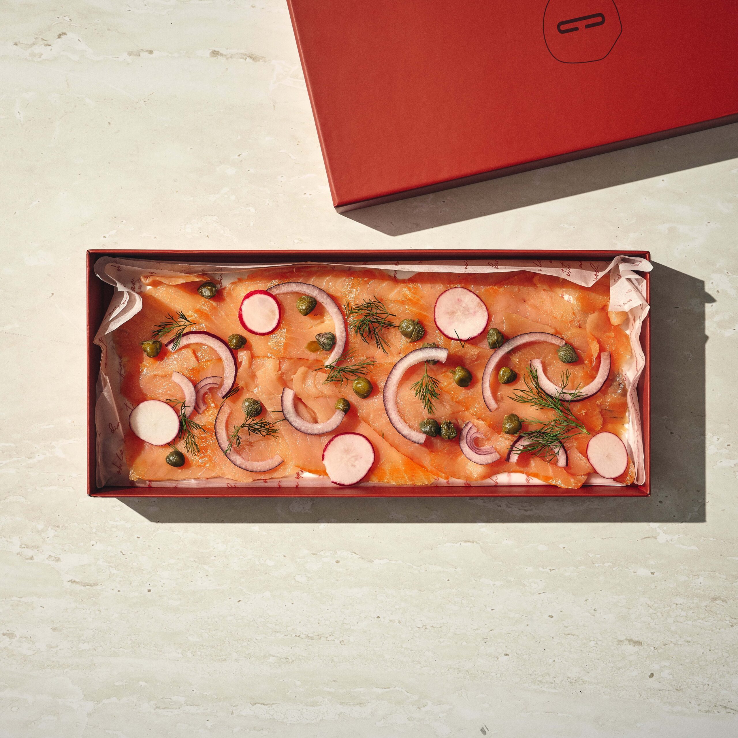 סלמון מעושן- פרוסות סלמון דקות בליווי צלפים ,בצל סגול , וצנונית.